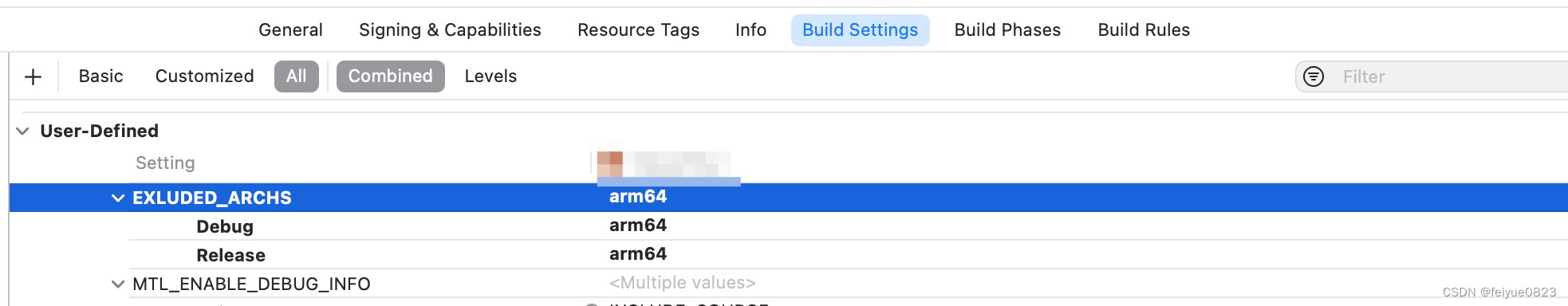 2、在 User-Defind 下面添加EXLUDED_ARCHS,设置arm64