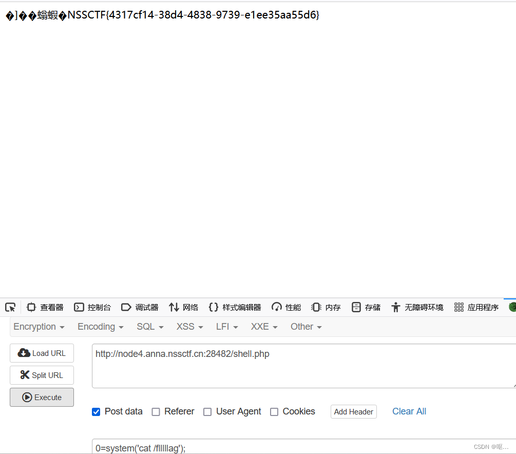 eval(system(cat /flag));:如果条件为真,则执行eval()函数并传入system(cat /flag)作为参数。system()函数用于执行系统命令,而cat /flag是一个系统命令,用于显示/flag文件的内容。因此,如果条件为真,就会执行/flag文件的内容。总体来说,这段代码的逻辑是判断 11 是否等于 11,根据判断结果将