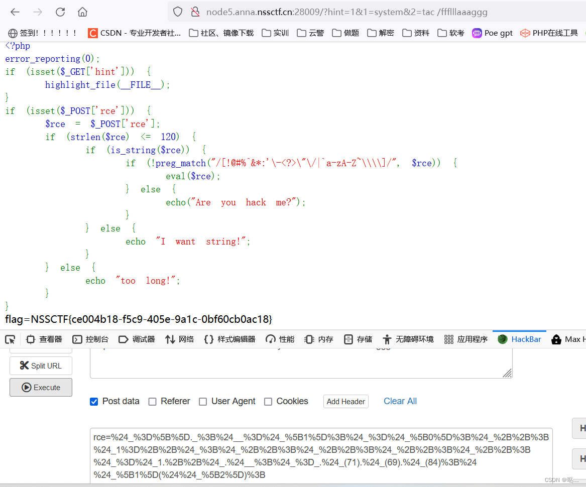 可以用的是$()+,.0123456789;=[]_{},一眼自增RCE,要求长度小于等于120。这里难办的是过滤了/,之前遇到的payload,但凡短一点的都有斜杠。