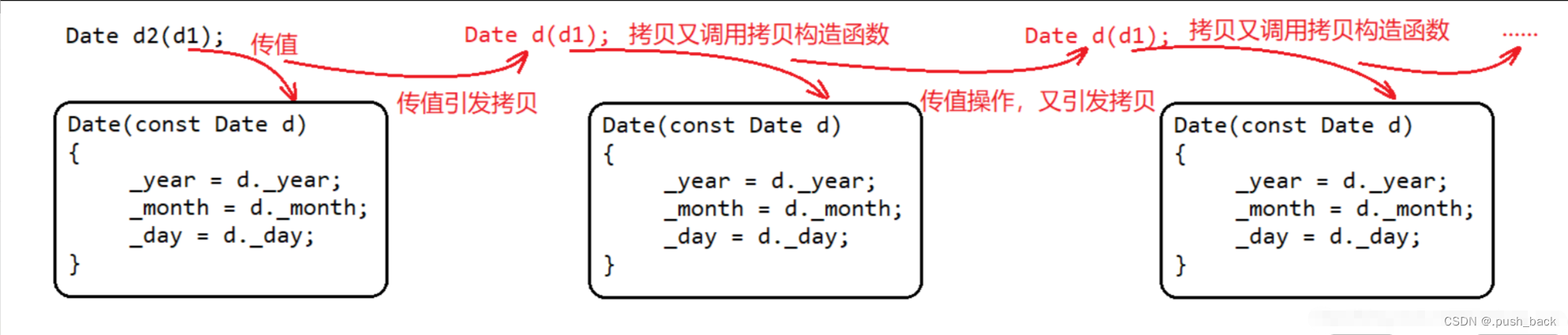 实例化对象d2时,参数并不是3个具体的int类型,而是已经存在的Date类的对象d1,那么就会调用拷贝构造函数,函数体内的功能就是用d1的成员变量赋值给d2的成员变量,从而初始化d2。