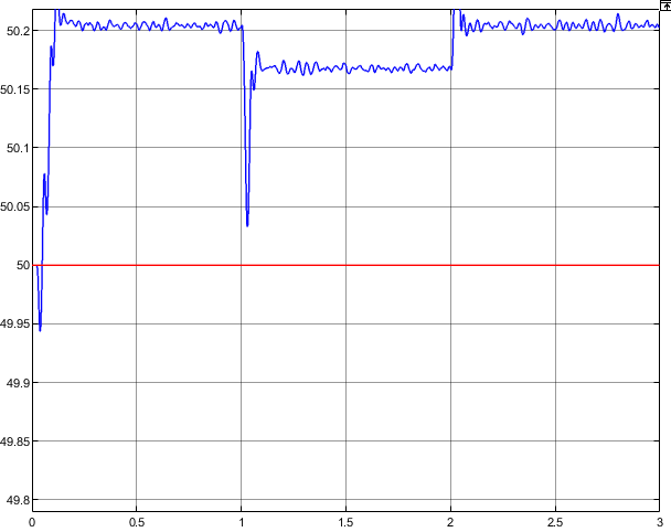 上图为没有加入二次频率补偿的公共点电压,下图为加入二次频率补偿后的效果。因为二次频率补偿后,频率会稳定在50Hz,增加了系统的稳定性。