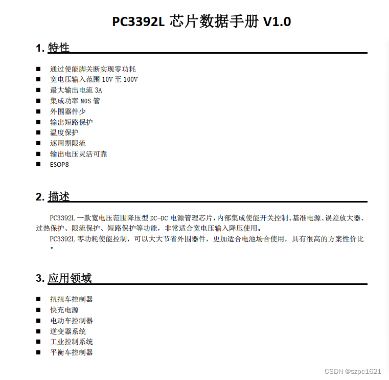 PC3392L 一款宽电压范围降压型 DC-DC 电源管理芯片,内部集成使能开关控制、基准电源、误差放大器、