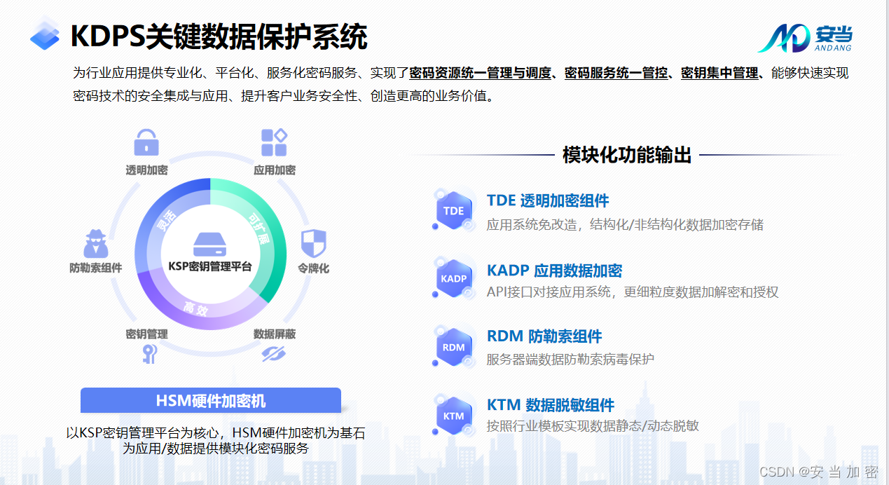 综上所述,安当KSP密钥管理系统具有较高的安全性、集中管理、多种算法支持、高效灵活和性价比高等特点,可以满足不同领域和场景的需求,同时可以根据不同用户需求进行定制化开发。
