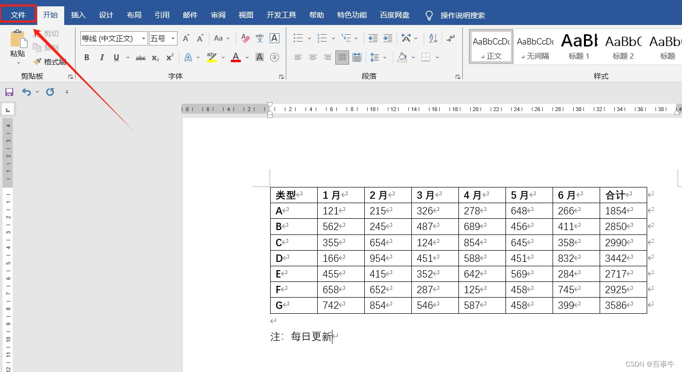 下面以图中表格为例:首先,打开需要处理的Word文档,然后点击菜单选项“文件”;