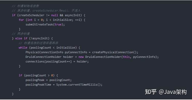 DruidDataSource的初始化时机是可选的,当我们设置init=true时,在createDataSource时就会调用DataSource.init()方法进行初始化,否则,只会在getConnection时再进行初始化。数据源初始化主要逻辑在DataSource.init()这个方法,可以概括为以下步骤: