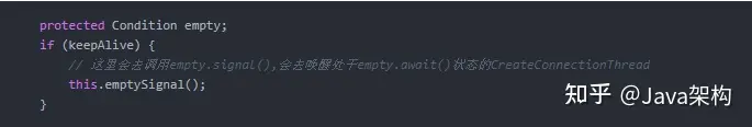 前面已经讲过,当我们调用empty.signal(),会去唤醒处于empty.await()状态的CreateConnectionThread。CreateConnectionThread这个线只有在需要创建连接时才运行,否则会一直等待,后面会讲到。