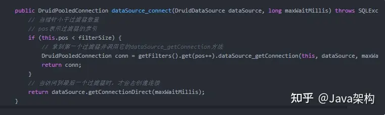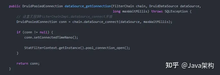 DruidDataSource.getConnectionInternal方法。除了获取连接对象,其他的大部分是校验和计数的内容。