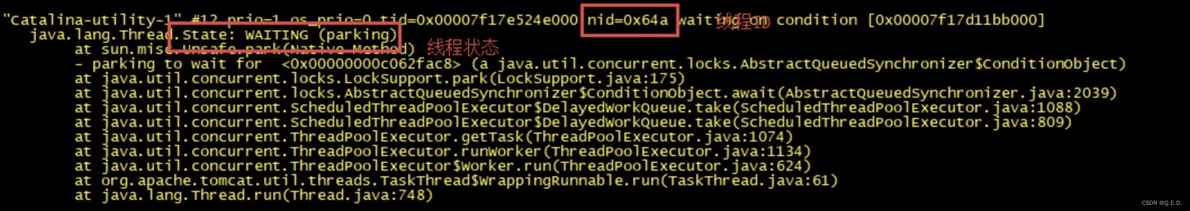每个线程堆栈的信息中,都可以查看到线程 ID、线程的状态(wait、sleep、running 等状态)以及是否持有锁等。