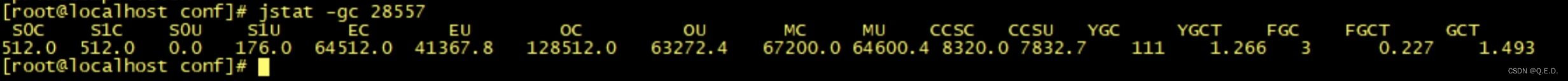 它的功能比较多,在这里我例举一个常用功能,如何使用 jstat 查看堆内存的使用情况。我们可以用 jstat -gc pid 查看: