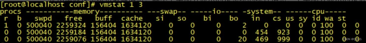 vmstat 是一款指定采样周期和次数的功能性监测工具,我们可以看到,它不仅可以统计内存的使用情况,还可以观测到 CPU 的使用率、swap 的使用情况。但 vmstat 一般很少用来查看内存的使用情况,而是经常被用来观察进程的上下文切换。