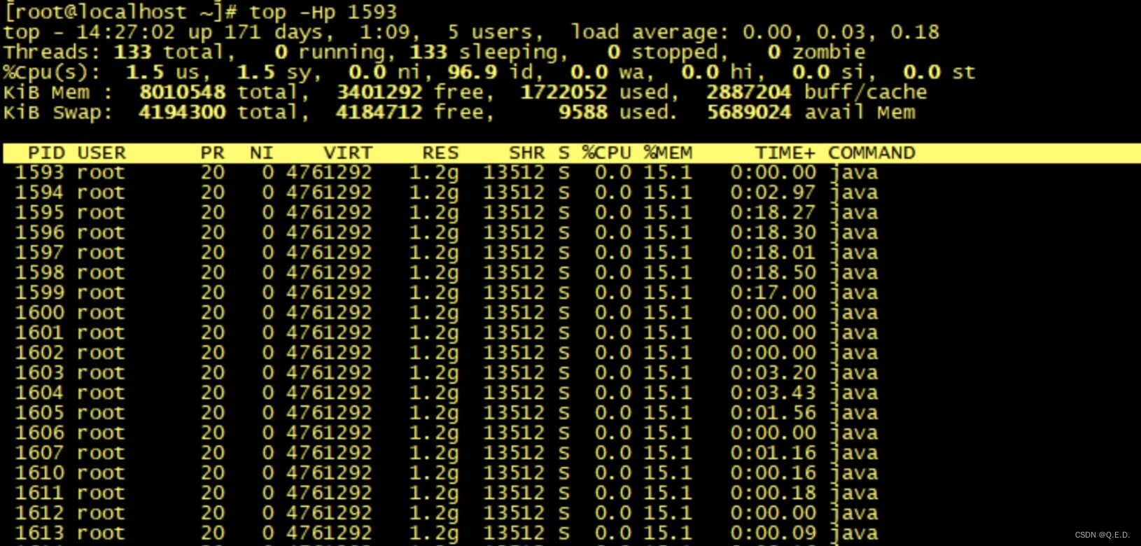 除了简单的 top 之外,我们还可以通过 top -Hp pid 查看具体线程使用系统资源情况:
