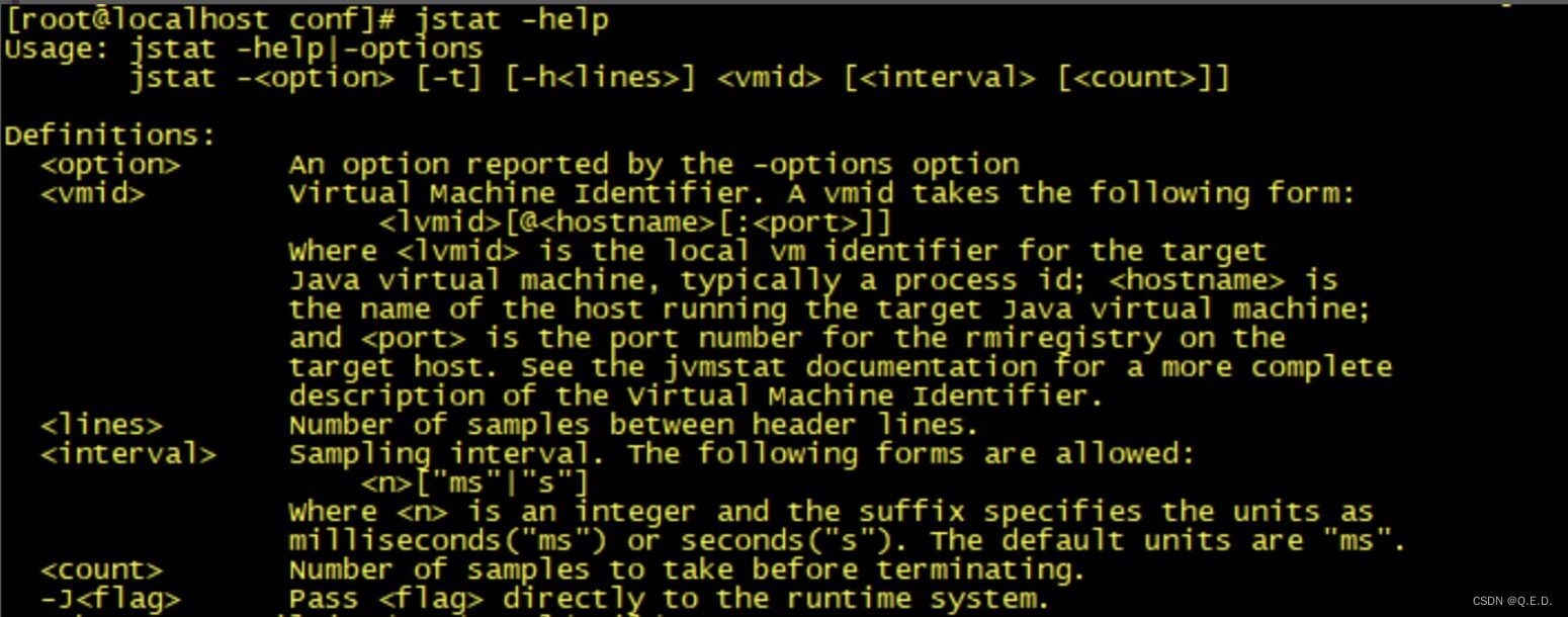 jstat 可以监测 Java 应用程序的实时运行情况,包括堆内存信息以及垃圾回收信息。我们可以运行 jstat -help 查看一些关键参数信息: