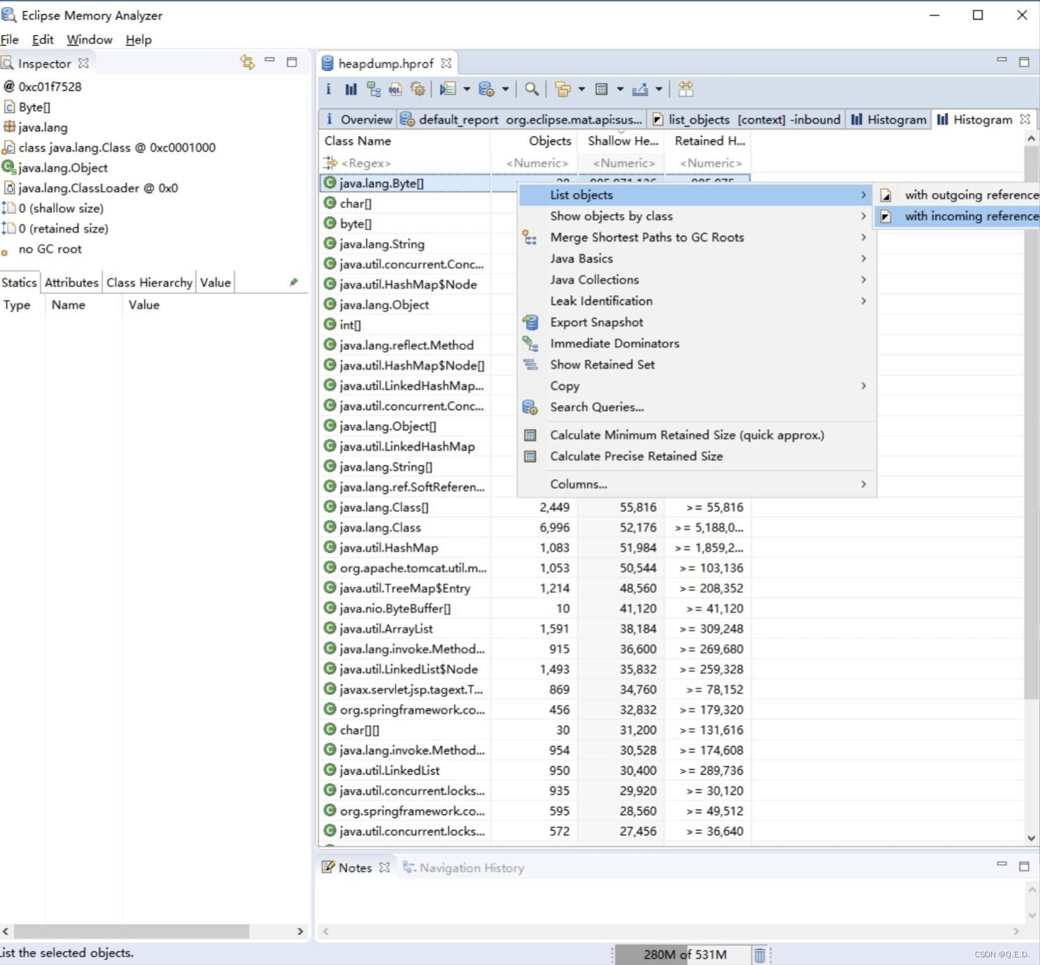 再点击进入到 Histogram 页面,可以查看到对象数量排序,我们可以看到 Byte[] 数组排在了第一位,选中对象后右击选择 with incomming reference 功能,可以查看到具体哪个对象引用了这个对象。