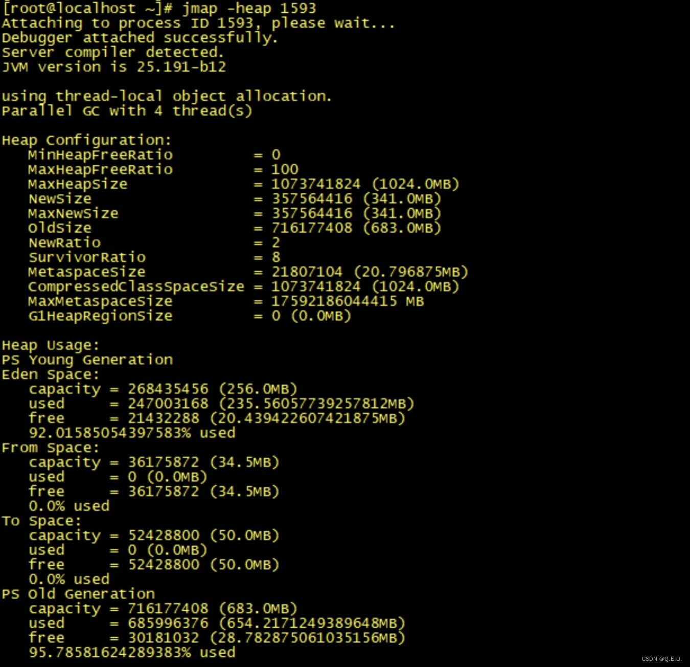 我们可以用 jmap 来查看堆内存初始化配置信息以及堆内存的使用情况: