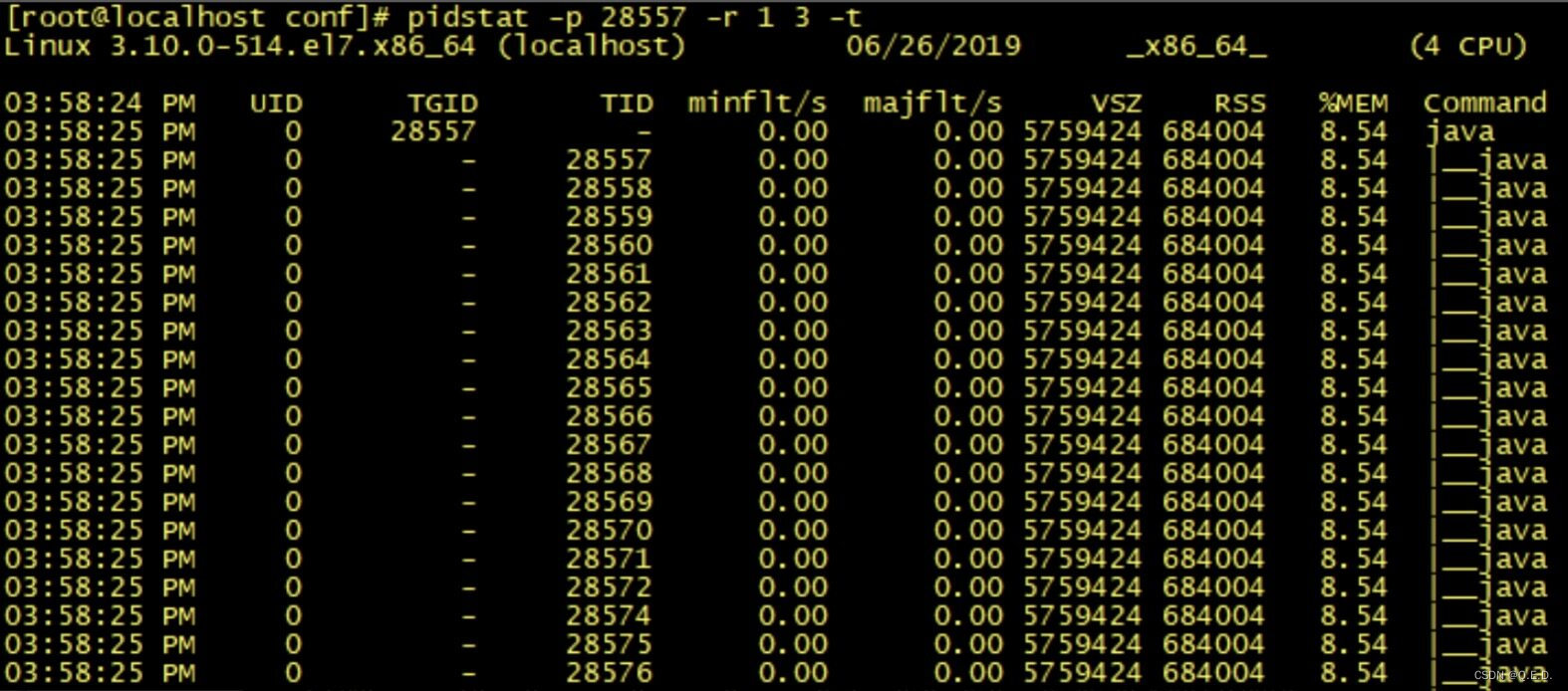 pidstat 是 Sysstat 中的一个组件,也是一款功能强大的性能监测工具,我们可以通过命令:yum install sysstat 安装该监控组件。之前的 top 和 vmstat 两个命令都是监测进程的内存、CPU 以及 I/O 使用情况,而 pidstat 命令则是深入到线程级别。