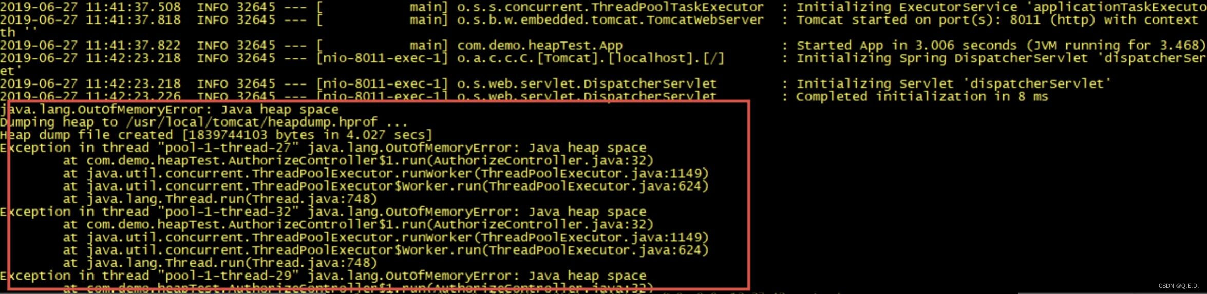 在启动应用程序之前,我们可以通过 HeapDumpOnOutOfMemoryError 和 HeapDumpPath 这两个参数开启堆内存异常日志,通过以下命令启动应用程序: