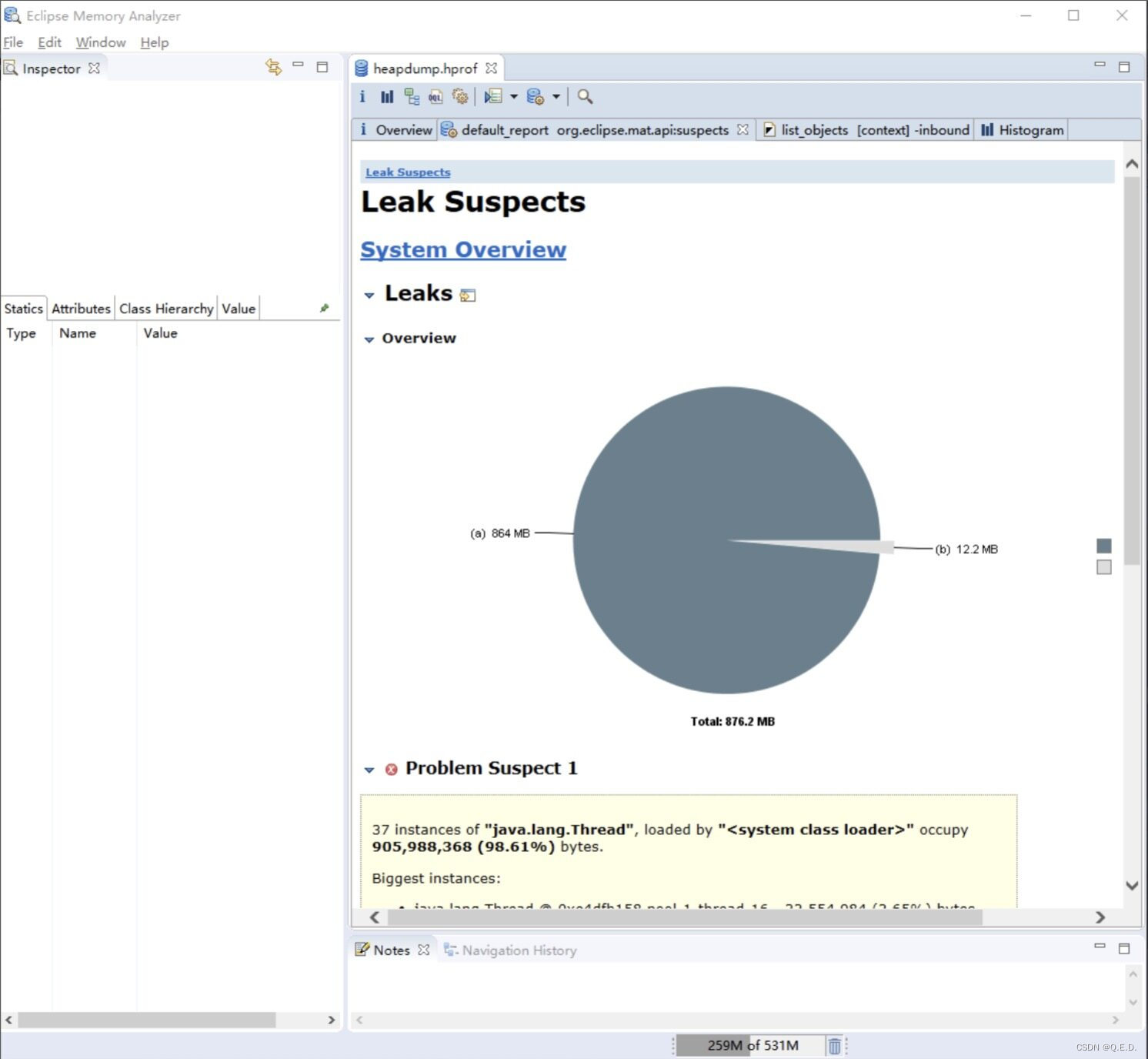 Byte 对象占用内存明显异常,说明代码中 Byte 对象存在内存泄漏,我们在启动时,已经设置了 dump 文件,通过 MAT 打开 dump 的内存日志文件,我们可以发现 MAT 已经提示了 byte 内存异常: