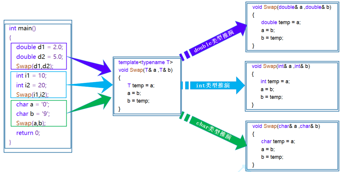 在编译器编译阶段,对于模板函数的使用,编译器需要根据传入的实参类型来推演生成对应类型的函数以供调用。比如:当用double类型使用函数模板时,编译器通过对实参类型的推演,将T确定为double类型,然后产生一份专门处理double类型的代码,对于字符类型也是如此