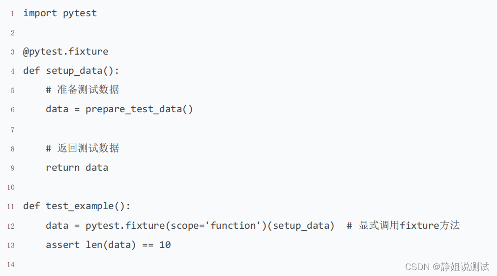 显式调用fixture方法是在测试函数中使用fixture名称作为参数来调用fixture方法。下面是一个示例: