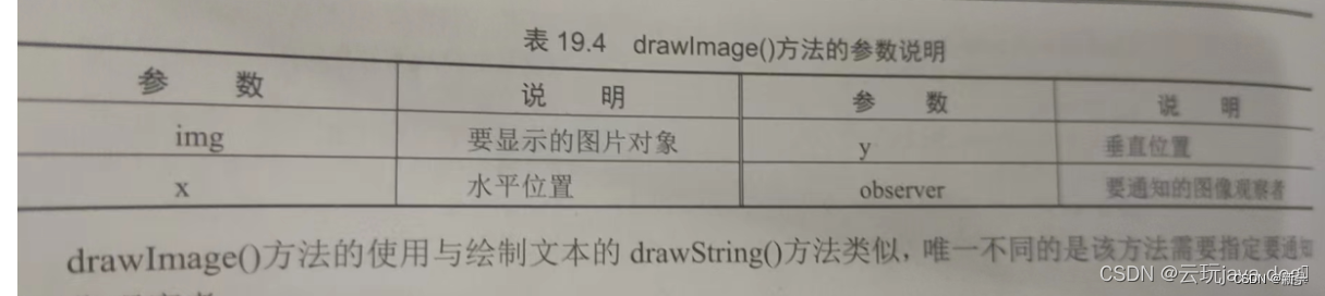 该方注将img图片显示在 x、y 指定的位置上。方法中涉及的参数说明如表 19.4 所示