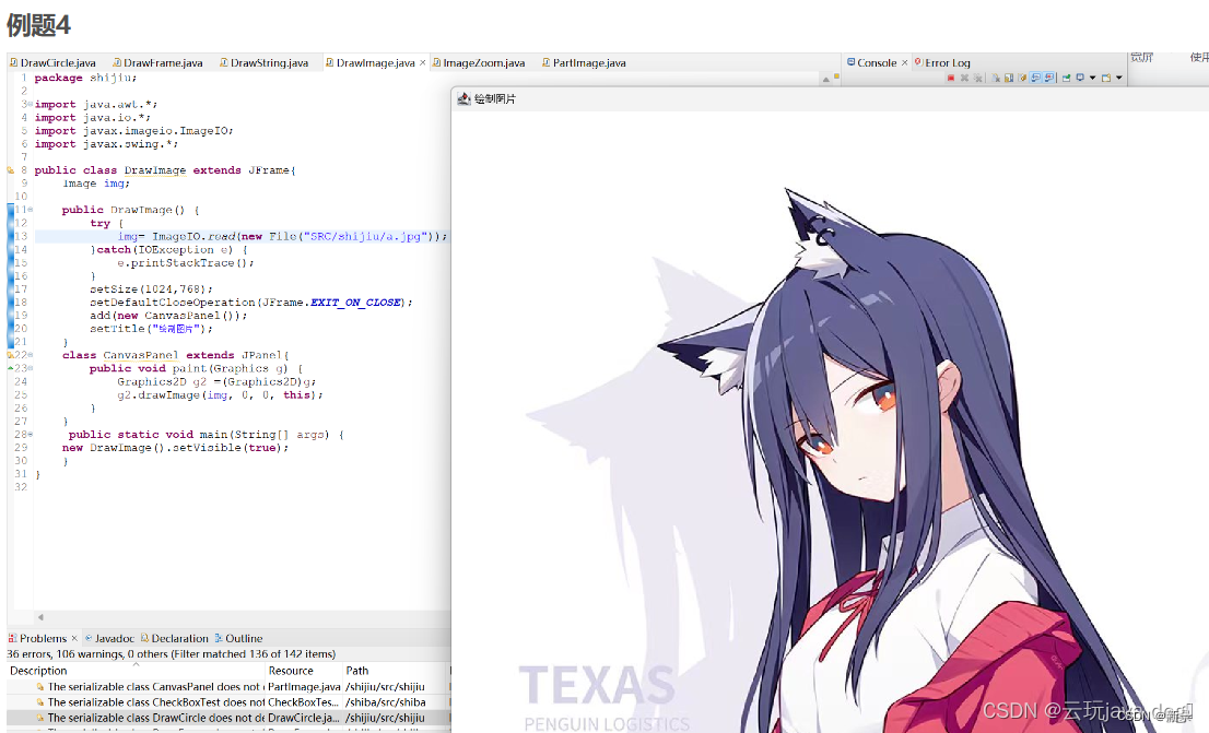 绘图类不仅可以绘制图形和文本,还可以使用 drawImage0方法将图片资源显示到绘图上下文中,而且可以实现各种特效处理,如图片的缩放、翻转等。有关图像处理的知识将在 19.6 节讲解,本节主要讲解如何显示图片。语法如下: