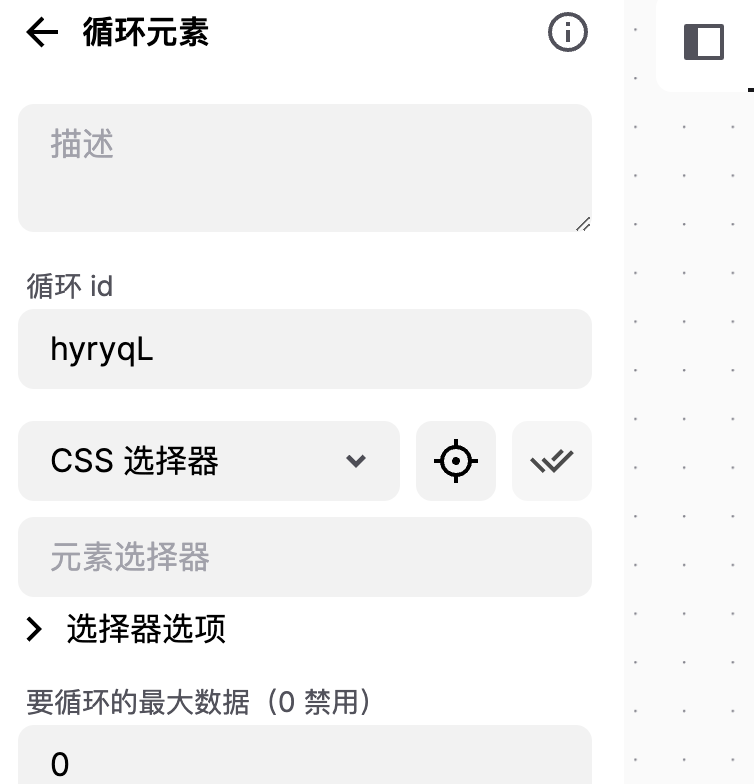 有时候我们要在页面上动态从一个表格或者列表读取元素,再获取对应数据执行后续操作。此时,可以用循环元素组件,然后选择css,会得到具有相同css的元素列表。后面再选择元素进行操作,就可以在css中用loopData做前缀, 如{{loopData@versions}} .ant-radio-input
