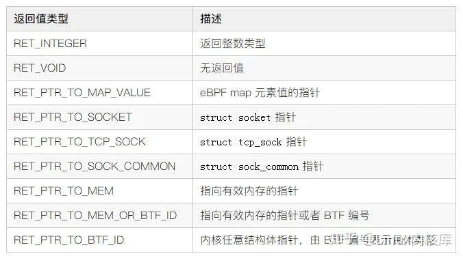 其中,func 表示该 eBPF 辅助函数的具体实现,实现了特定的功能。bpf_return_type 描述该 eBPF 辅助函数的返回参数类型,而 argx_type 描述该函数的入参类型。下面将对入参类型和返回值类型进行解析。