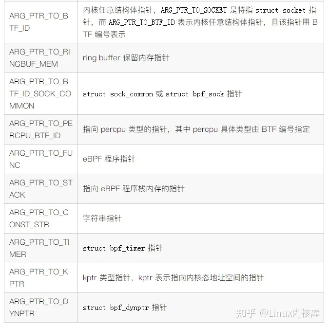 ARG_PTR_TO_SOCKET 表示 struct socket 指针;2)由 BTF 编号确定数据类型的指针类型,如 ARG_PTR_TO_BTF_ID 表示某一内核数据类型指针,且该内核数据类型由 BTF 编号指定;3)指向某一类型内存的指针,如 ARG_PTR_TO_MAP_KEY 指向 eBPF 程序栈内存的指针。ARG_CONST_SIZE 表示整数,且该整数的值不能为 0;ARG_ANYTHING,其表示任意类型,但是需要初始化该值,否则 eBPF verifier 会报 未初始化 等相关错误。完整的基本类型如下表所示:
