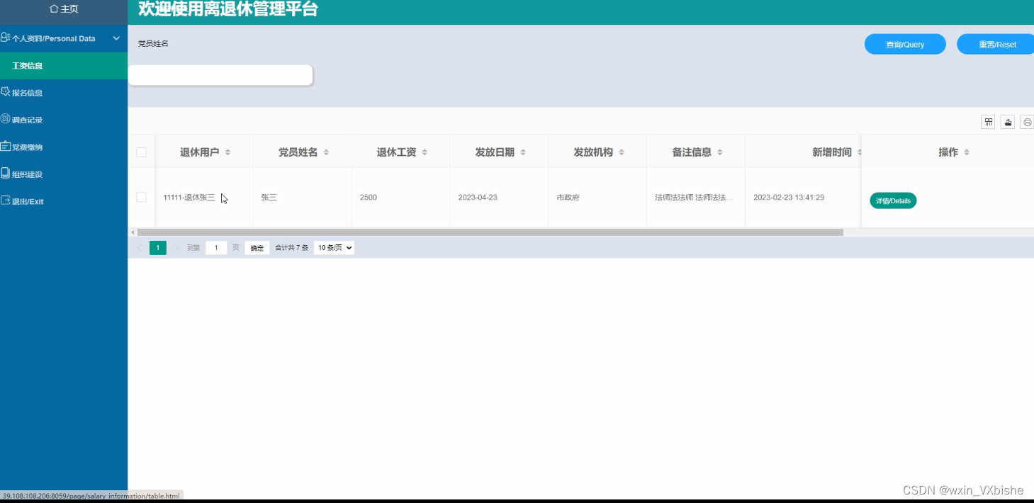 工资信息管理,在工资信息管理可查看退休用户、党员姓名、退休工资、发放日期、发放机构、备注信息等信息,如图5-7所示。
