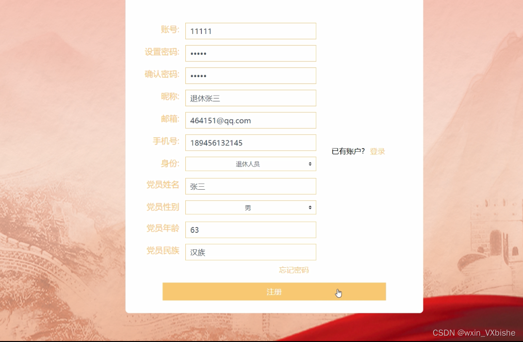 在系统首页注册,用户在前台页面注册信息:用户名、密码、姓名、性别、出生年月、邮箱、手机、身份证、头像、地址、备注等内容,如图5-8所示: