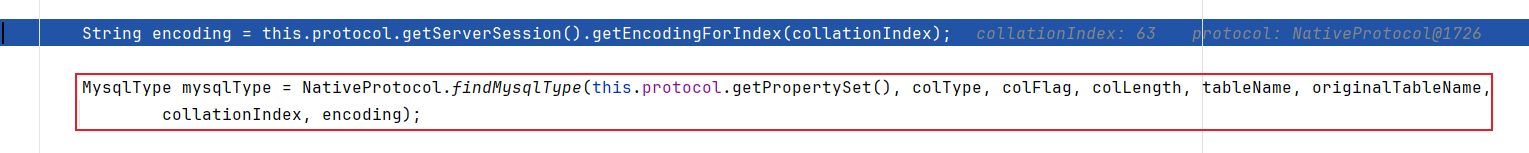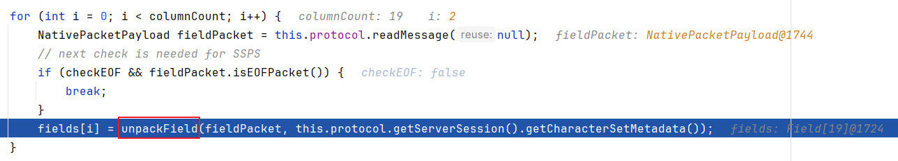 为了节约时间,我就不带你们一步一步 debug 了,直接带你们来到关键点 com.mysql.cj.protocol.a.ColumnDefinitionReader#read