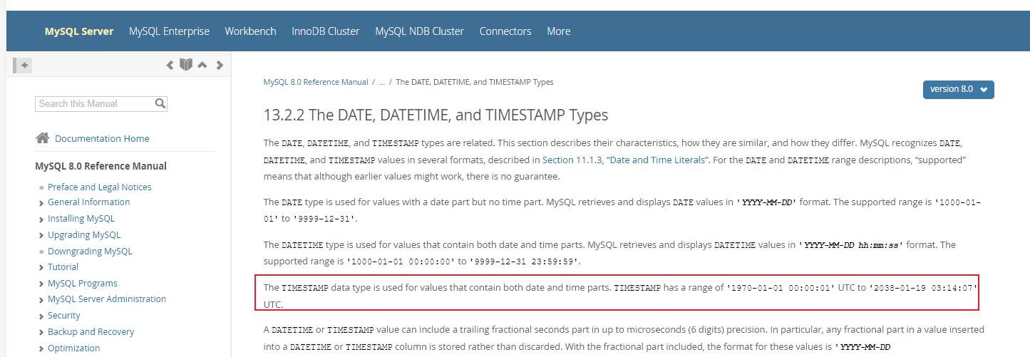 MySQL8 ,范围是 '1970-01-01 00:00:01' UTC to '2038-01-19 03:14:07' UTC