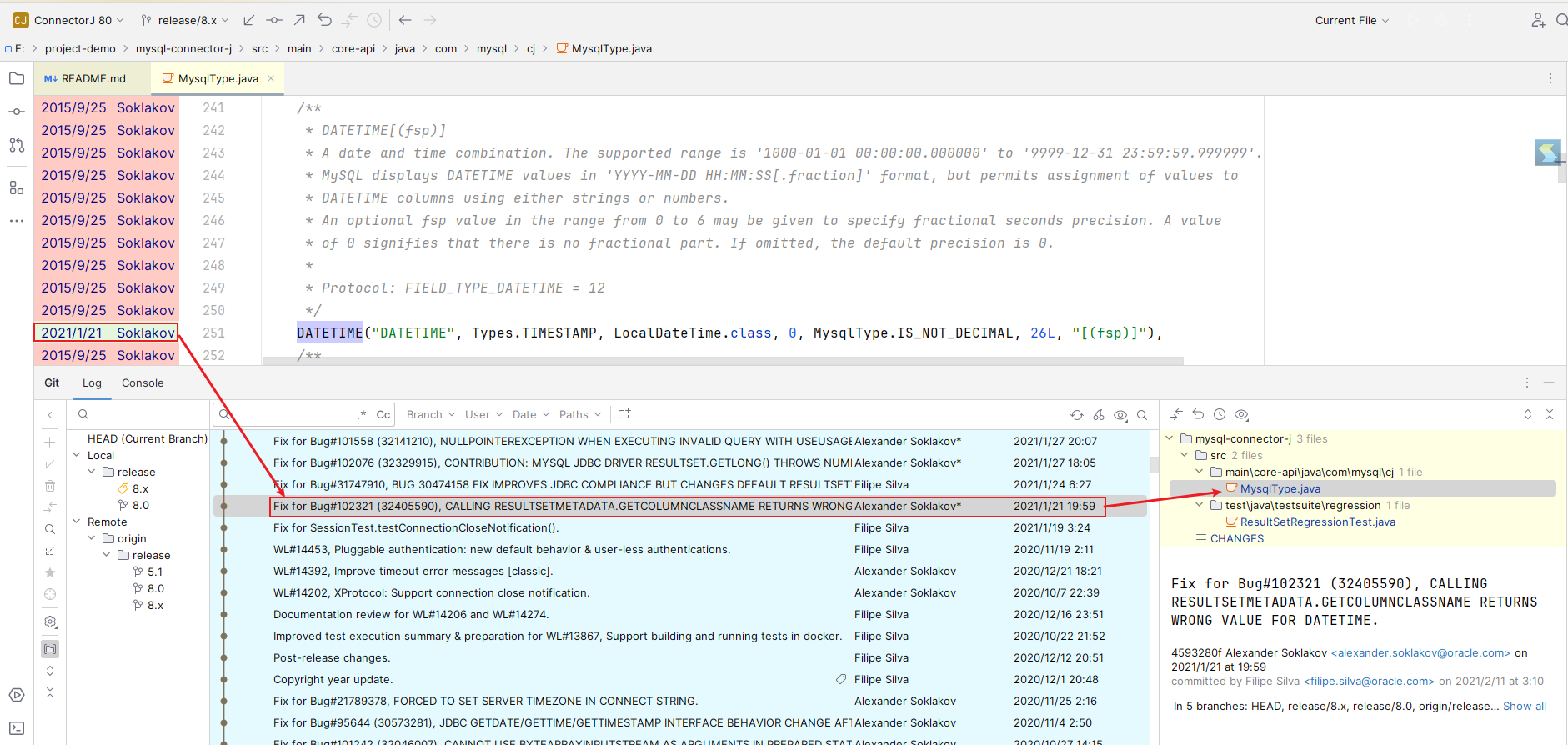 我把 mysql-connector-java 的源码 clone 下来了,更方便我们查看提交记录