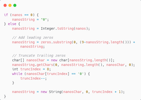 去掉 nanosString 末尾的 0,并没有影响时间值的准确性,但是可以简化整个字符串,末尾跟着一串0,可读性会降低