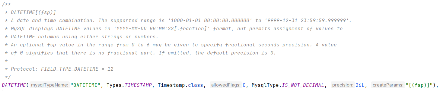 比如 mysql-connector-java , 8.0.24 之前, DATETIME 对应的 JAVA 类型是 java.sql.Timestamp ,而 8.0.24 及之后,对应的是 java.time.LocalDateTime
