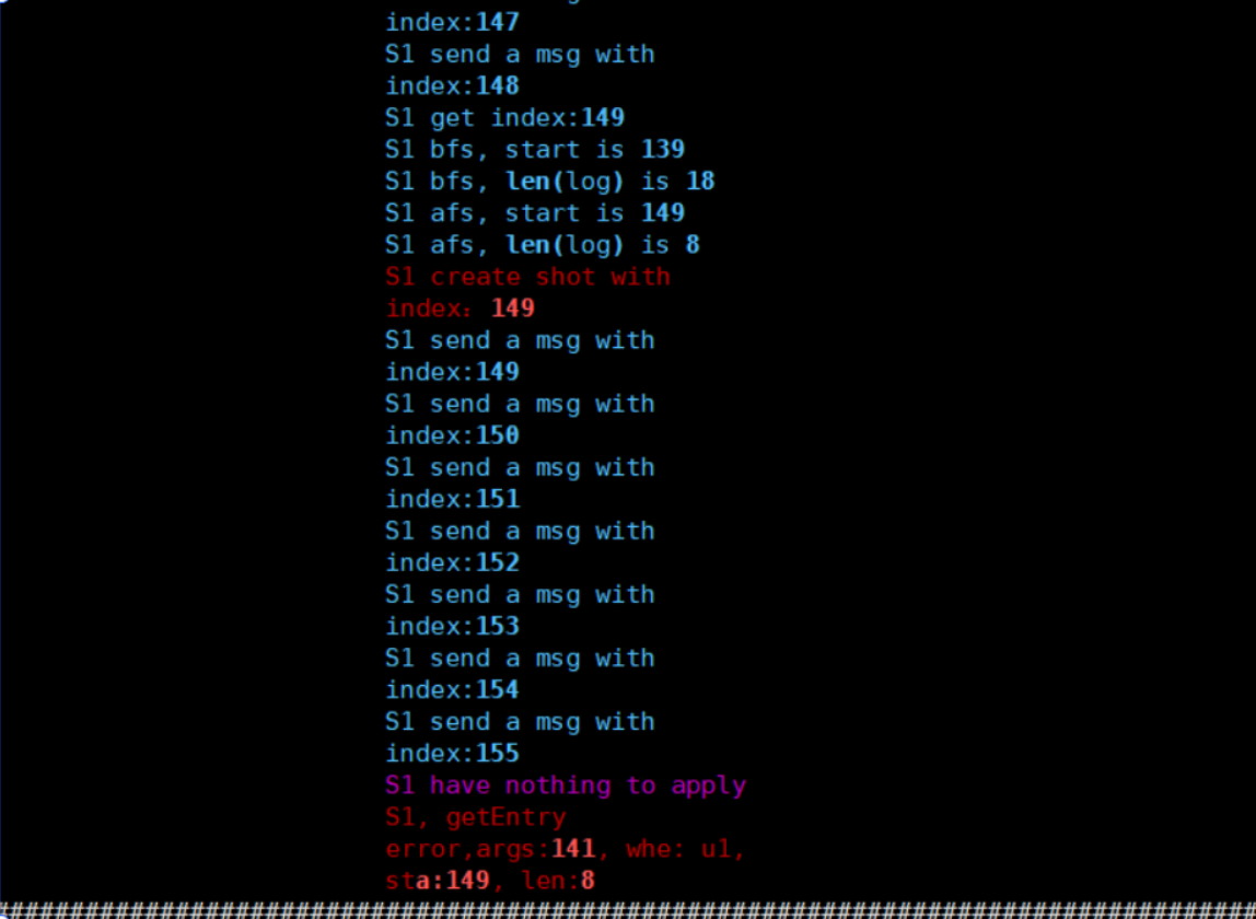 出错的点在于follower这边:leader方发送出去的时候prevLogIndex没有低于其自身的start,故没有发送快照,但是接收方收到日志条目之后,由于已经截断了日志,并不能匹配prevLogIndex。