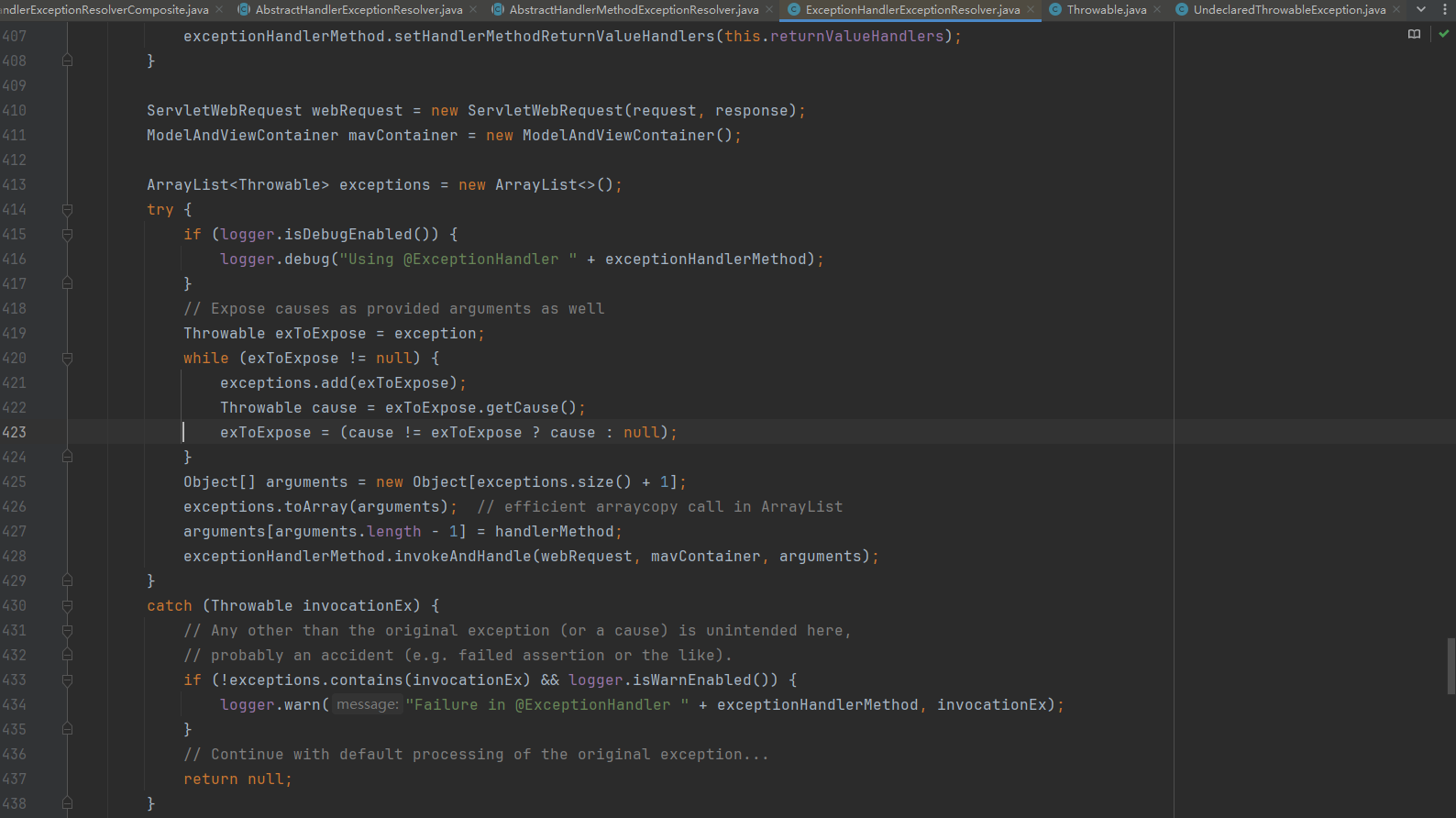 具体调试流程就不展开了,最终在SpringBoot的ExceptionHandlerExceptionResolver中找到了答案,看下面的422和423行代码,cause调用了Throwable的getCause()方法: