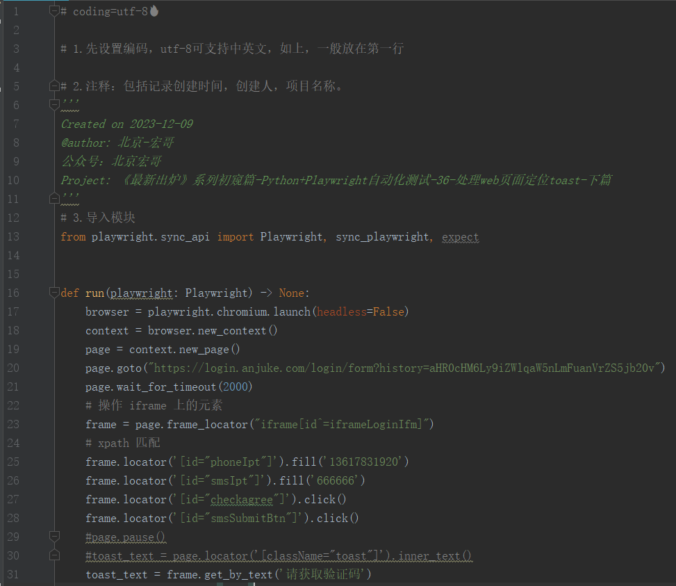 # coding=utf-8🔥 # 1.先设置编码,utf-8可支持中英文,如上,一般放在第一行 # 2.注释:包括记录创建时间,创建人,项目名称。 ''' Created on 2023-12-09 @author: 北京-宏哥 公众号:北京宏哥 Project: 《最新出炉》系列初窥篇-Python+Playwright自动化测试-36-处理web页面定位toast-下篇 ''' # 3.导入模块 from playwright.sync_api import Playwright, sync_playwright, expect def run(playwright: Playwright) -> None: browser = playwright.chromium.launch(headless=False) context = browser.new_context() page = context.new_page() page.goto("https://login.anjuke.com/login/form?history=aHR0cHM6Ly9iZWlqaW5nLmFuanVrZS5jb20v") page.wait_for_timeout(2000) # 操作 iframe 上的元素 frame = page.frame_locator("iframe[id^=iframeLoginIfm]") # xpath 匹配 frame.locator('[id="phoneIpt"]').fill('13617831920') frame.locator('[id="smsIpt"]').fill('666666') frame.locator('[id="checkagree"]').click() frame.locator('[id="smsSubmitBtn"]').click() #page.pause() #toast_text = page.locator('[className="toast"]').inner_text() toast_text = frame.get_by_text('请获取验证码') page.wait_for_timeout(3000) #page.pause() print("Toast text is",toast_text.inner_text()) context.close() browser.close() with sync_playwright() as playwright: run(playwright)