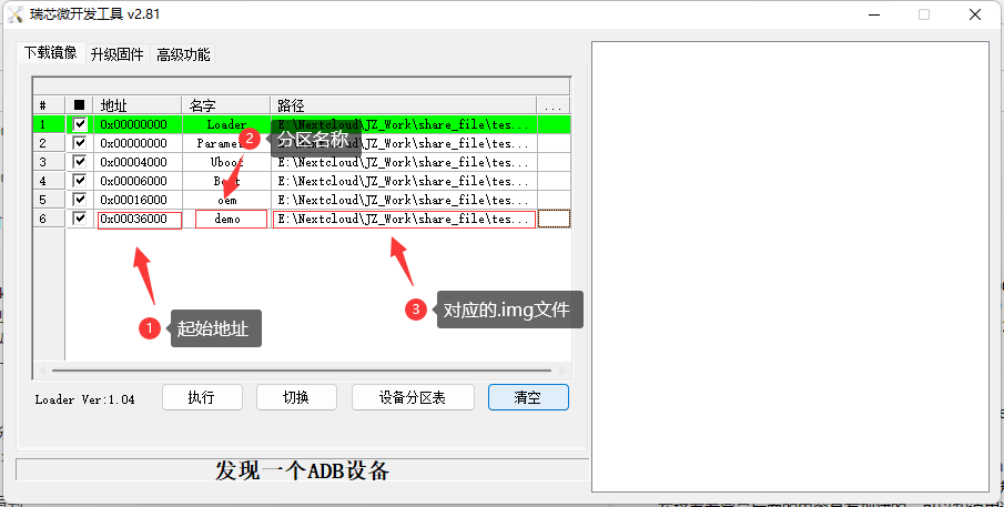 其次,我们需要制作自己的分区,并烧写到对应的其实地址即可,分区的制作就比较简单了,不知道的可以参考我之前的笔记linux下制作img文件,制作好 img 文件后,烧写即可,;烧写规则如下图所示: