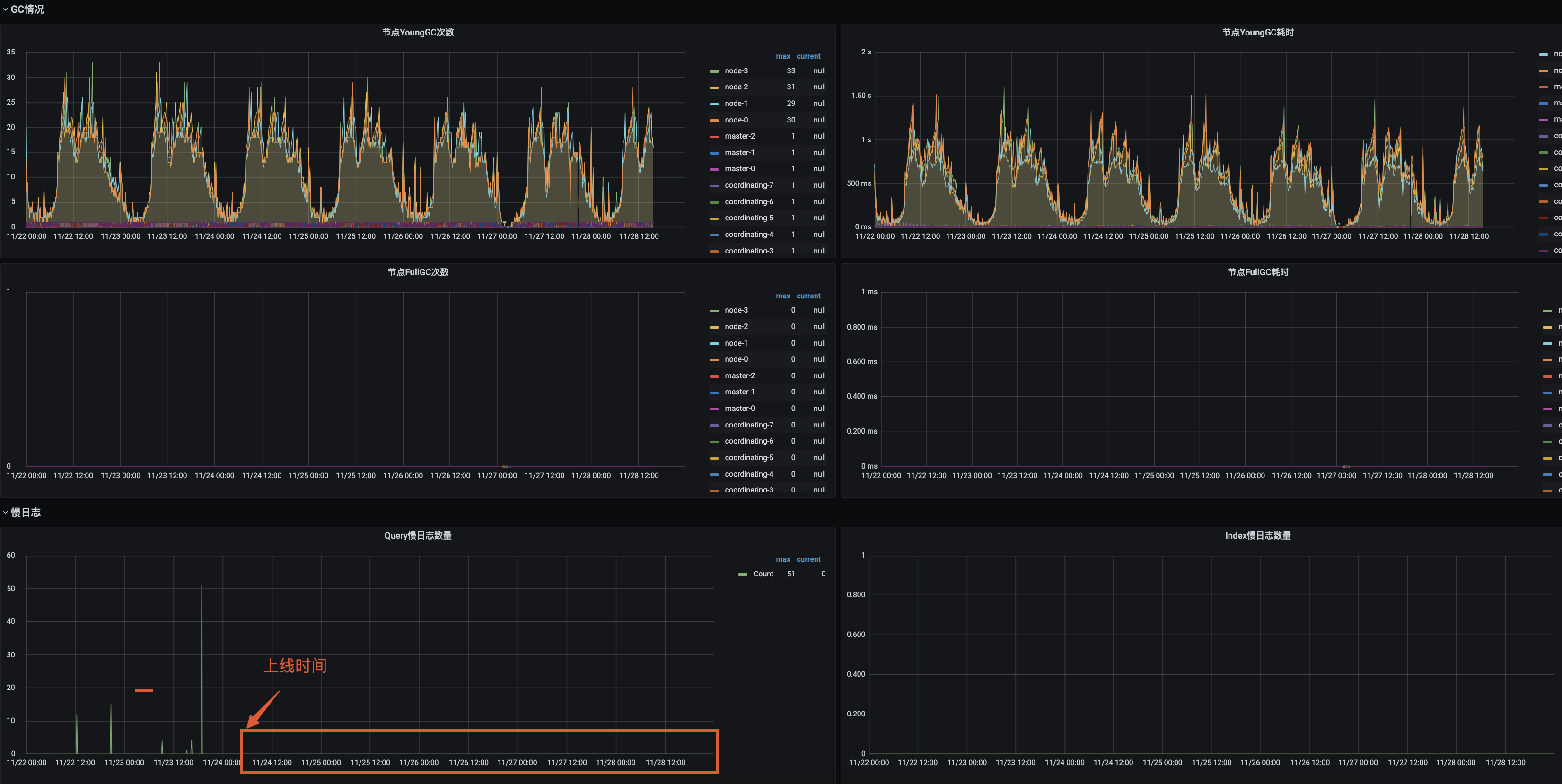 - YGC:耗时极其不正常, 峰值200+次,耗时7s+