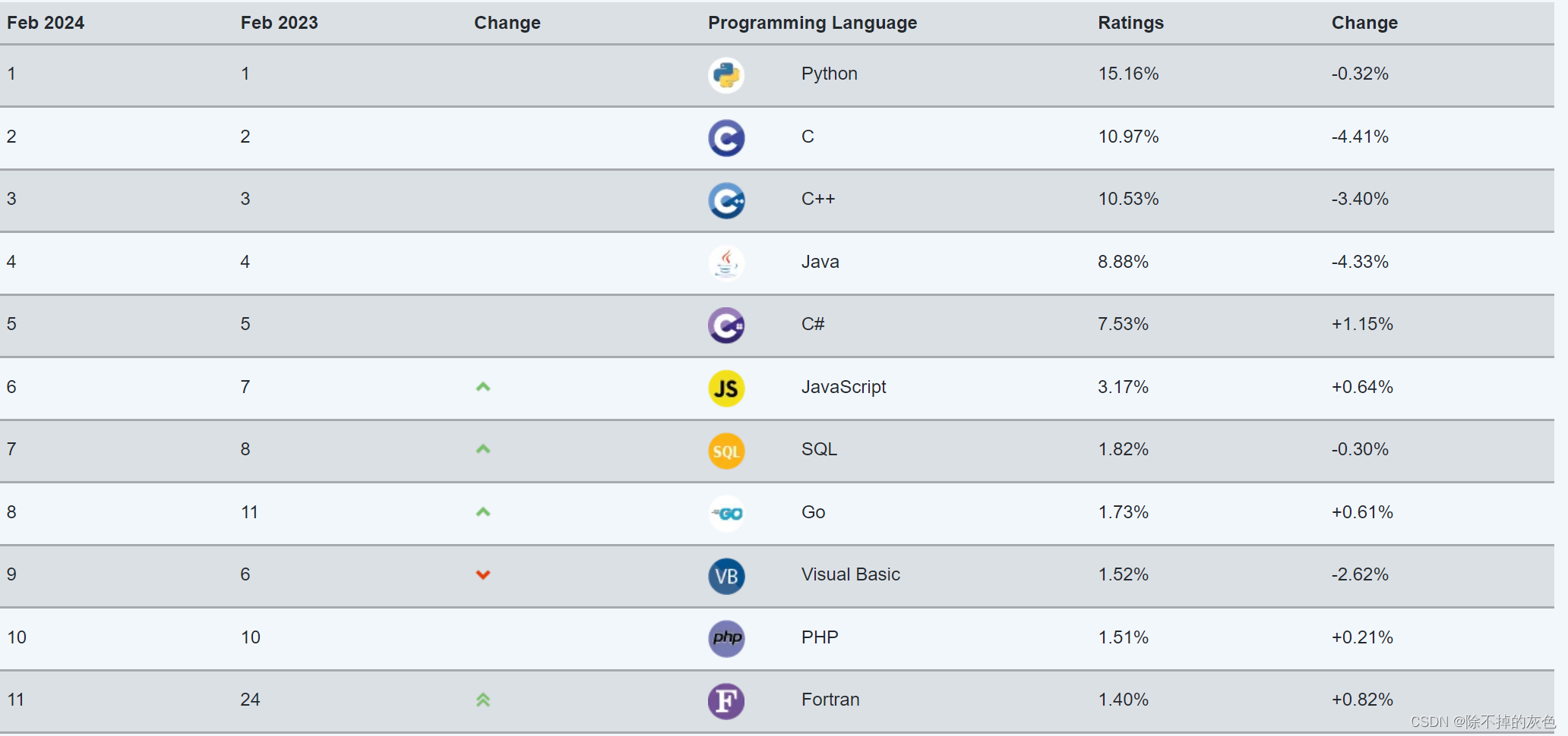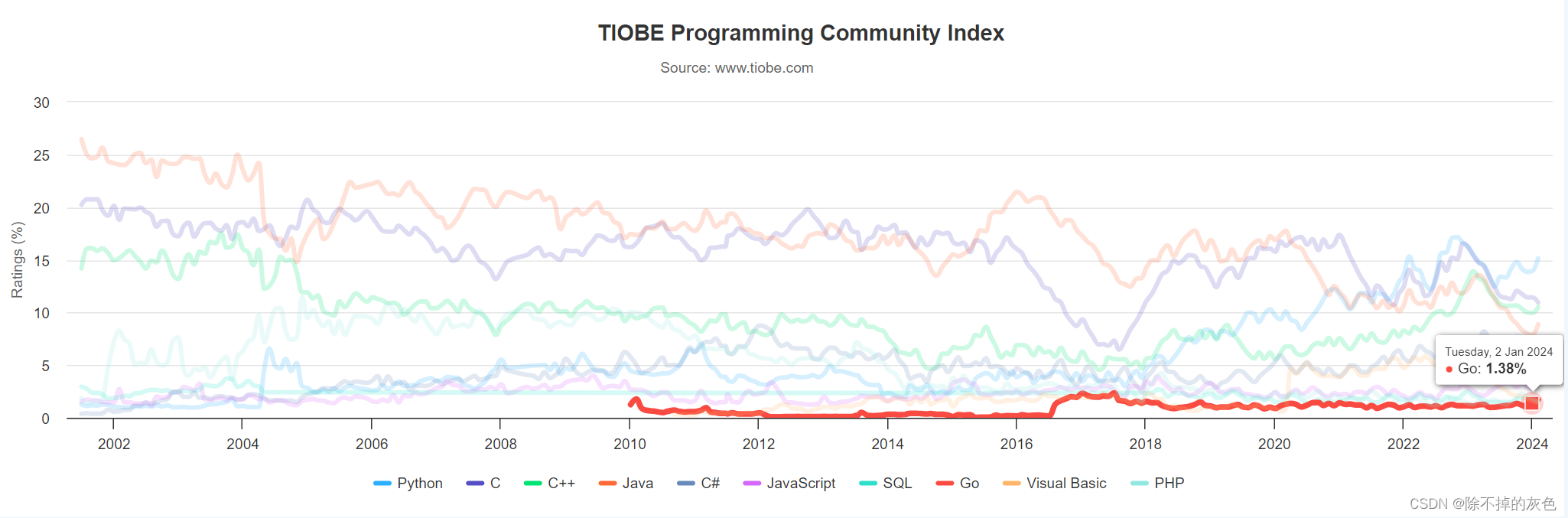 TIOBE编程社区指数是编程语言流行程度的指标。该索引每月更新一次。评级基于全球熟练工程师的数量、课程和第三方供应商。热门网站谷歌、亚马逊、维基百科、必应和其他20多个引擎被用来计算评分。需要注意的是,TIOBE索引不是关于最佳编程语言或大多数代码行所用的语言。