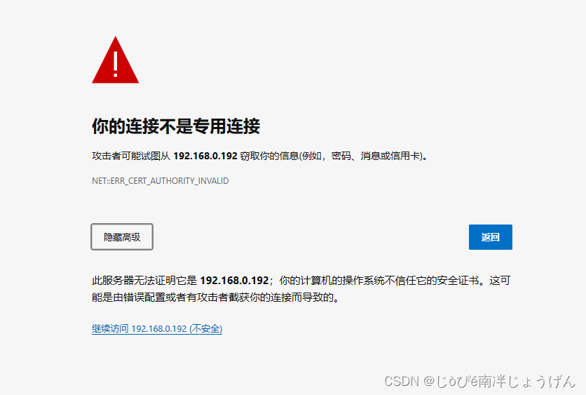 在 Vue CLI 项目的 vue.config.js 文件中添加配置,在这里https:true就是可以开启https了,但是没有或者没有配置有效证书的话,会出现下面的提示: