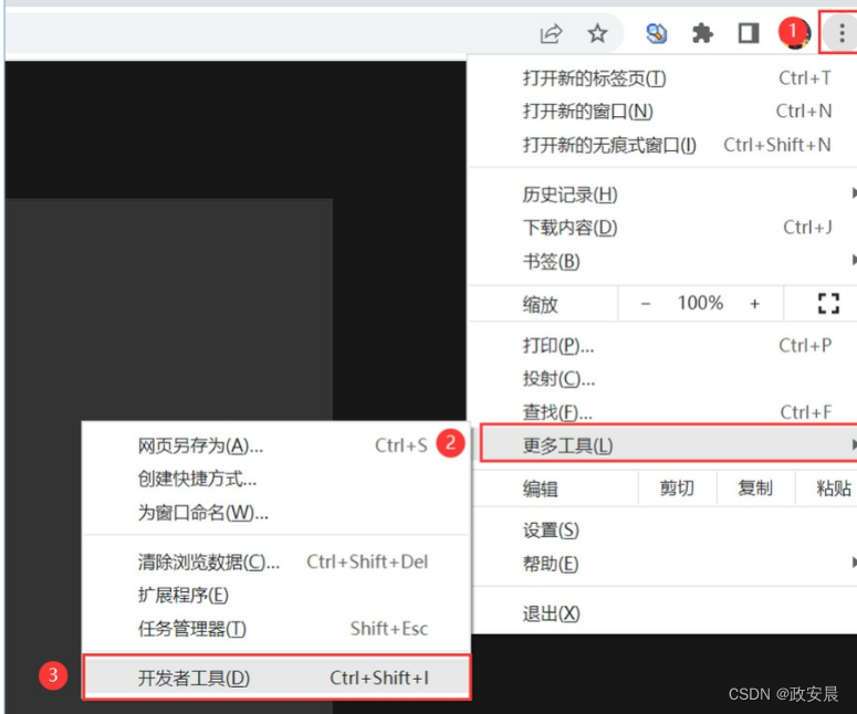 我们可以使用快捷键F12,或者点击Chrome浏览器右上角的三个点的按钮,选择【更多工具】→【开发者工具】命令,打开浏览器的开发者工具,如下图所示: