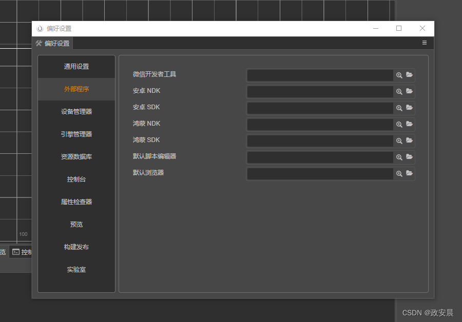接下来,就可以将它们配置为Cocos Creator的默认外部程序了。在Cocos Creator编辑器主菜单中选择【Cocos Creator】→【偏好设置】选项,打开编辑器的偏好设置面板,如下图所示: