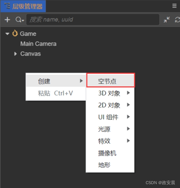 在场景中创建一个空节点,并让其作为脚本组件的载体。右击层级管理器内的空白区域,在弹出的快捷菜单中选择【创建】→【空节点】命令,并将其重命名为Node,如下图所示: