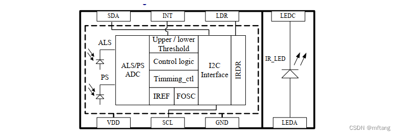 由下结构图可以看见: ALS和PS分别和ADC模块连接,以采集外部数据 。IR本分隔在一个单独的模块。