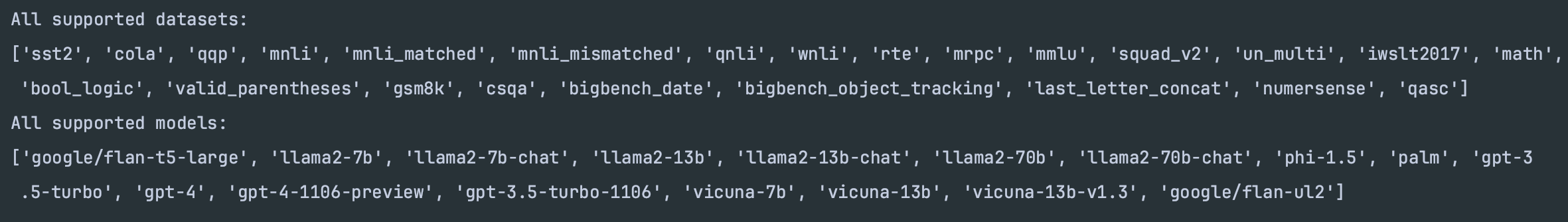 数据集列表打印:['sst2', 'cola', 'qqp', 'mnli', 'mnli_matched', 'mnli_mismatched', 'qnli', 'wnli', 'rte', 'mrpc', 'mmlu', 'squad_v2', 'un_multi', 'iwslt2017', 'math', 'bool_logic', 'valid_parentheses', 'gsm8k', 'csqa', 'bigbench_date', 'bigbench_object_tracking', 'last_letter_concat', 'numersense', 'qasc']