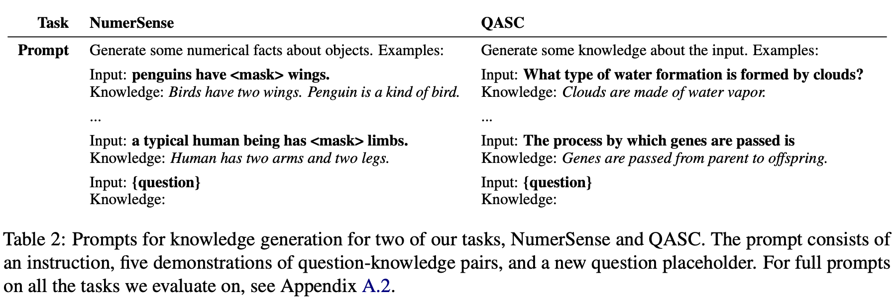 generate knowledge:文章链接,https://arxiv.org/pdf/2110.08387.pdf。大概就是在回答问题时提供知识(其中包括从语言模型生成知识)作为prompt的附加输入。比如在问答的情景下,除了Question这个输入,Prompt里还有Knowledge这一项。